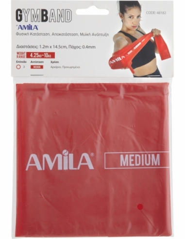 Λάστιχο αντίστασης AMILA GymBand κορδέλα μήκους 1,2 m. Είναι κατασκευασμένο από φυσικό Latex και διακρίνεται για την ιδιαίτερη αντοχή του ακόμα και σε επαγγελματικό επίπεδο ενώ χρησιμοποιείται από πάρα πολλούς αθλητές και γυμναστές. Διαστάσεις 120x45 cm